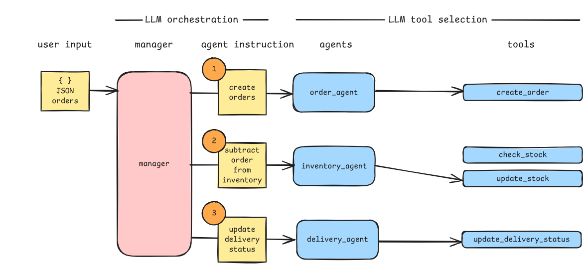 In this example, ToolCallingAgents are used. Three agents are created: an inventory_agent, an order_agent, and a delivery_agent, with a manager to coordinate them.